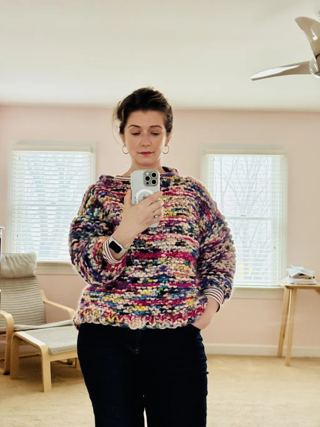The proportions in the pattern are a little off, but this is a roomy, forgiving sweater that is immensely cozy. I am wearing it right now and I love love love it. If I make it again, I'll make the sleeves a little longer and the neck slightly different.