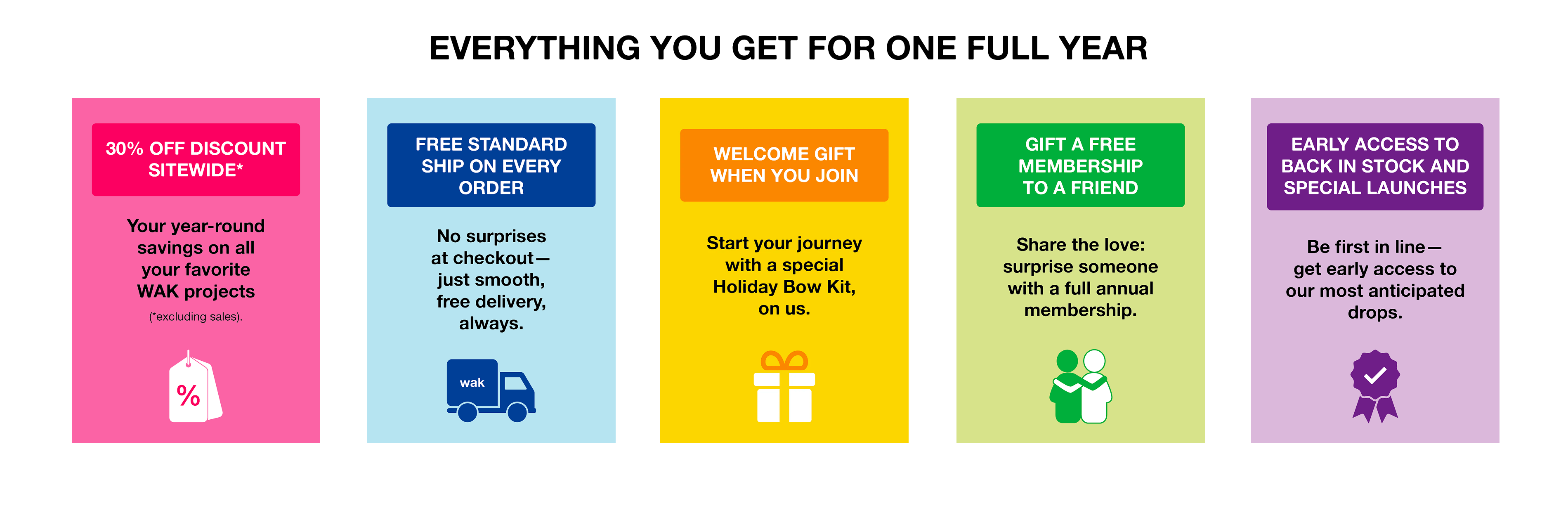 You get 30% off sitewide* year-round (excluding sales), free standard shipping on every order, a welcome gift, the ability to gift an annual membership to a friend, early access to restocks and special launches, and exclusive access to our patterns section. All perks last for one full year.
